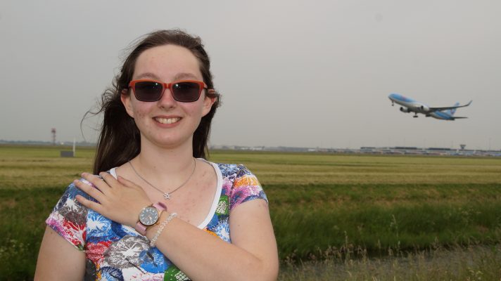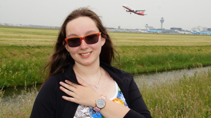 Franziska Lampen präsentiert eine POP-PILOT Uhr am Flughafen Shipol Amsterdam.